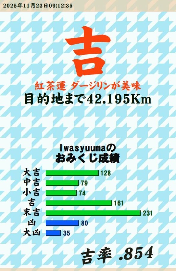 今日のおみくじ! 二日連続の吉 吉率0.85406(+0.00019)(673/788) https://p.eagate.573.jp/gate/e/toomikuji.html?from=article