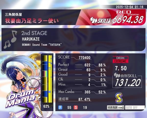 アタックエフェクトもBonus Notesもオフした。HARUKAZE が90%以上になって、133点を超えた!長いHHロールを除く、全部HHがゴリ押しでした。PRIME LIGHT の二つの黃譜は良い練習曲です。11回、十連発です。 #足ミラー使い #ギタドラ 爆花和閃notes都關了。 #HARUKAZE 90後,超過了133分!長HH roll以外,全部HH硬食。PRIME LIGHT 兩份黃譜是好練習曲。11回,十連發。 #足鏡使者
