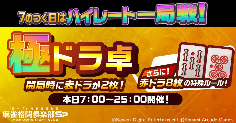 7のつく日はハイレート一局戦! 本日7:00~25:00まで開催! 本日のルールは「極ドラ卓」! 開局時に表ドラが2枚、赤ドラが8枚の特殊ルールです。 MG大量獲得を目指しましょう! ▼イベント詳細 https://p.eagate.573.jp/game/mfc/mfc_sp/howto/taku/highrate/index.html #麻雀格闘倶楽部Sp
