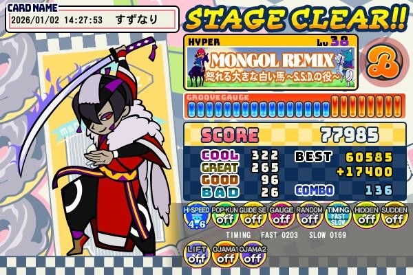 モンゴルREMIXのH譜面(*´ω`*) ひさしぶりのスコア記録・更新ヽ(・∀・)ノ