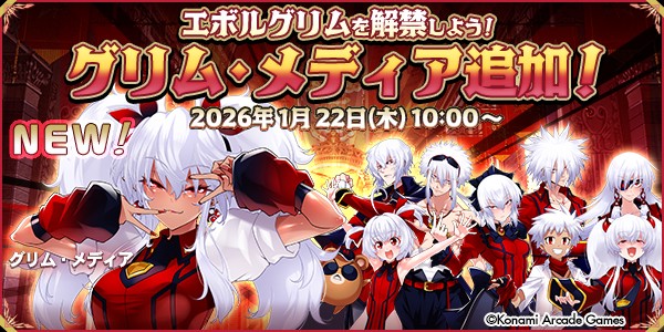 1/22(木)10:00からエボルグリム解禁キャラクター「グリム・メディア」を追加! “解禁エナジー”をためて「グリム・メディア」を解禁、プレーキャラクターとして使おう! https://p.eagate.573.jp/game/qma/19/info/ #QMA #緋のアルカディア
