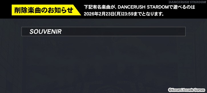 【削除楽曲のお知らせ】 下記楽曲が #DANCERUSH_STARDOM で遊べるのは、 2026年2月23日(月)23:59までとなります。 まだプレーしていなかったら、さっそく踊ってみよう! #ダンスラッシュ #BEMANI