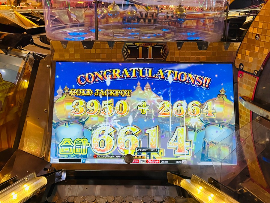 2026年2月5日 JACKPOT第28号!! GOLD JACKPOT 6654 WIN 3950+BONUS 2664 今更ながら、グランドクロスゴールドをプレーするのは今回が初めてでした。スロットは空気でなかなか揃わないので、メダルが減る一方だったけど、割とそこまで沼らないでJPCに行けてたしその2回目のJPCでなんと 初プレーでGOLD JACKPOTが当たりました!! これが、ビギナーズラックかしら? 初期値2500なので、結構溜まってましたね! 上乗せ配当もまあデカい!
