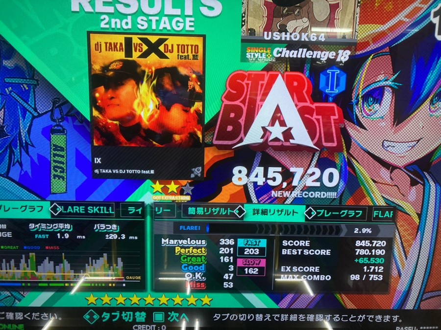 前半でゲージ溶かして早々にⅢまで落ちたので、サビ以降全て踏ん張って耐えた。結果、DP九段クリアした時と同じ気持ちで踏んでた。