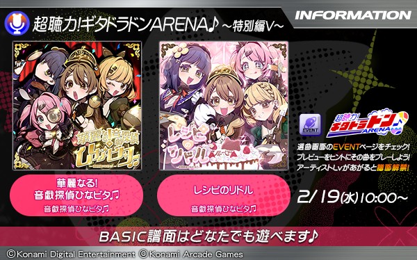 【超聴力!ギタドラドンARENA♪~特別編Ⅴ~】 2/19(木)から音戯探偵ひなビタ♫ 調査依頼:BEMANIの楽曲が登場! EVENTの「超聴力!ギタドラドンARENA♪」ページをチェック♪ プレビューから推理してプレーすると譜面解禁! 「ひなビタ♪」から出題! ※BASIC譜面は最初から遊べます #GITADORA