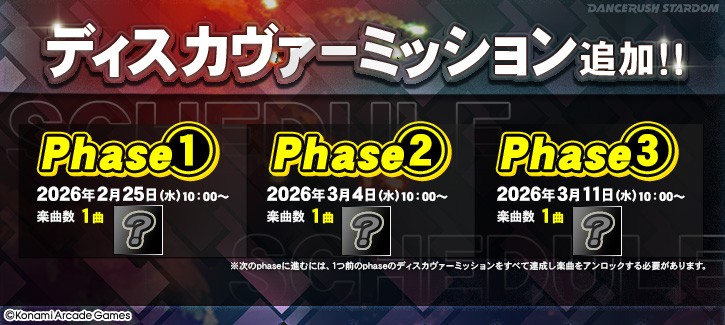 【ディスカヴァーミッション追加!】 2月25日(水)10:00より、ディスカヴァーミッションが追加! 選曲画面に登場した「?」を選択して、表示されたミッションにチャレンジしていこう! 週ごとに新曲が追加されていくのでスケジュールをCHECK! #DANCERUSH_STARDOM #ダンスラッシュ #BEMANI