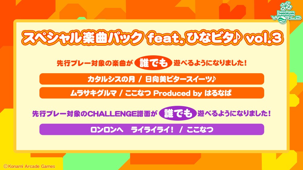 【楽曲パックに関するお知らせ】 2月27日(金)15:00(JST)より、「スペシャル楽曲パック feat.ひなビタ♪ vol.3」の先行プレー対象が誰でも遊べるようになりました。 皆様ぜひお楽しみください! #DDR #DDR_GRANDPRIX #DDR_WORLD #BEMANI https://p.eagate.573.jp/game/ddr/