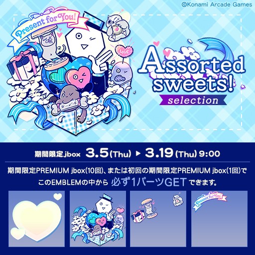 【たっぷりつまった気持ち】 本日より期間限定jbox「Assorted sweets!・セレクション」が登場! 初回のみ「期間限定 PREMIUM jbox(1回)」でSPエンブレムのパーツから1つ確定で出現しますよ! http://eagate.573.jp/game/jubeat/beyond/jbox/