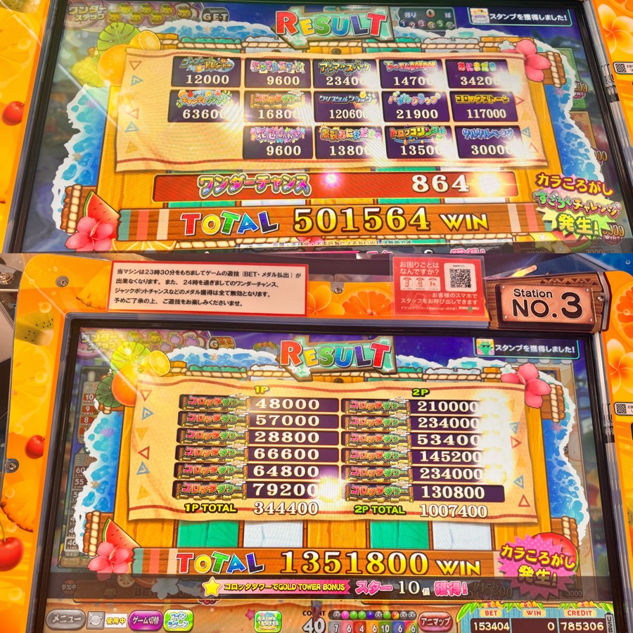 久しぶりの都内の店舗へ! 3クレのイベントが実施されていたので終日MAXBET(笑) 開幕から33球で最高役2面(ストーン・クラック)取れて50万overの配当💎 そこから見所なくアニマとカラコ合わせて400万ほど投資した後に常連さんがSPチャレンジでミラクルボールからSP入賞でパーフェクト確定ゲーム✨ タワー12面で遊んでいたので良い配色祈りつつ無事7桁出すことが出来ました!欲を言えば後半にout入りすぎたのと左半面の配当弱すぎたのが悔いあります(笑)