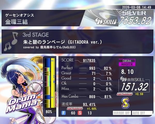 とりあえず150点に乗せました 右手で左シンバルを取ろうとすると高確率でスカります (´;ω;`)