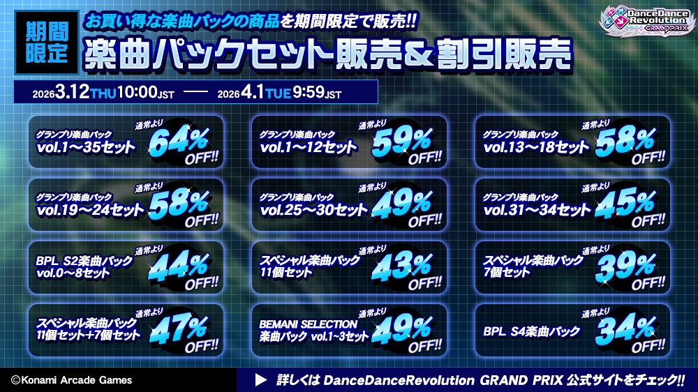3月12日(木)10:00から4月1日(水)9:59(JST)まで、楽曲パックのセット販売および割引販売をいたします。 通常よりお買い得となりますので、この機会にぜひお求めください! #DDR #DDR_GRANDPRIX #BEMANI https://p.eagate.573.jp/game/eacddr/konaddr/index.html