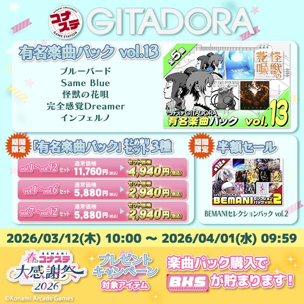 【BEMANI春のコナステ大感謝祭2026】 3/12(木)より #コナステ #ギタドラ 楽曲パック「有名楽曲パック vol.13」が登場! また、期間限定半額キャンペーンの開催や有名楽曲パックのセット商品も登場! パックの購入で #コナステ大感謝祭 プレゼントキャンペーンのBKSが貯まります!