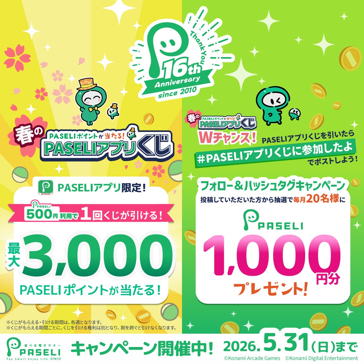 🎊祝!16周年🎊 いつもご利用いただきありがとうございます。 おかげさまでPASELIは16周年を迎えました🎉 皆様の生活をもっと楽しくする電子マネーを目指してキャンペーン開催中です✨ 春のPASELIアプリくじ https://p.eagate.573.jp/game/paseli/campaign/P25_05/?utm_medium=banner&utm_campaign=P25_05&utm_source=s&id=10 フォロー&ハッシュタグキャンペーン https://p.eagate.573.jp/game/paseli/campaign/P25_05/hashtag/index.html&id=10