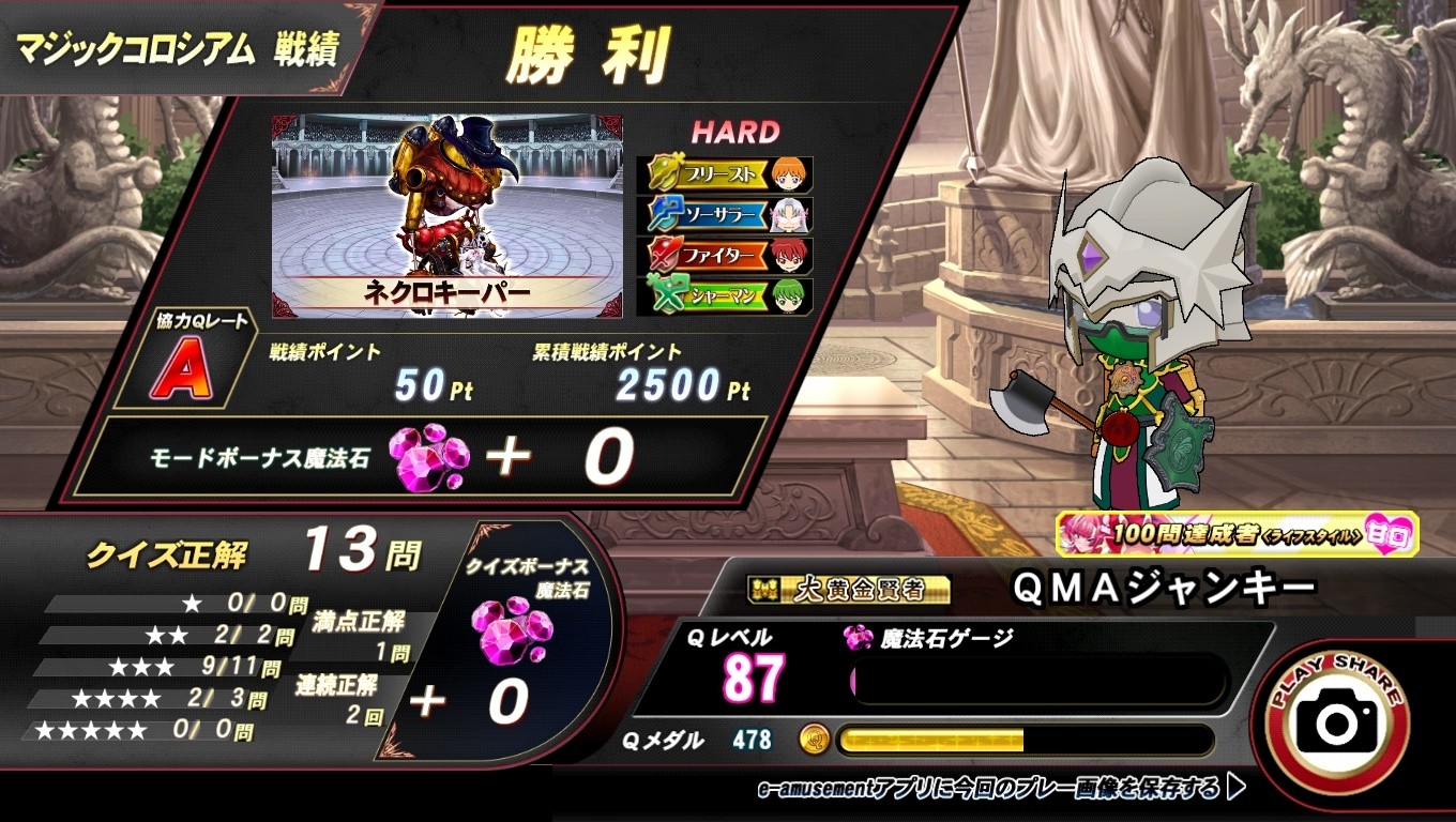 マジコロHARD2回目 マッチングされた方1人のため、2キャラCPU 自分はプリースト使用 14問目、全員攻撃すれば勝てる状況 CPUファイターは攻撃したのですが・・・・・・ CPUシャーマン、攻撃せずヒーリング使ってしまいました。 18問目じゃなくて良かった、と考えるべきかな
