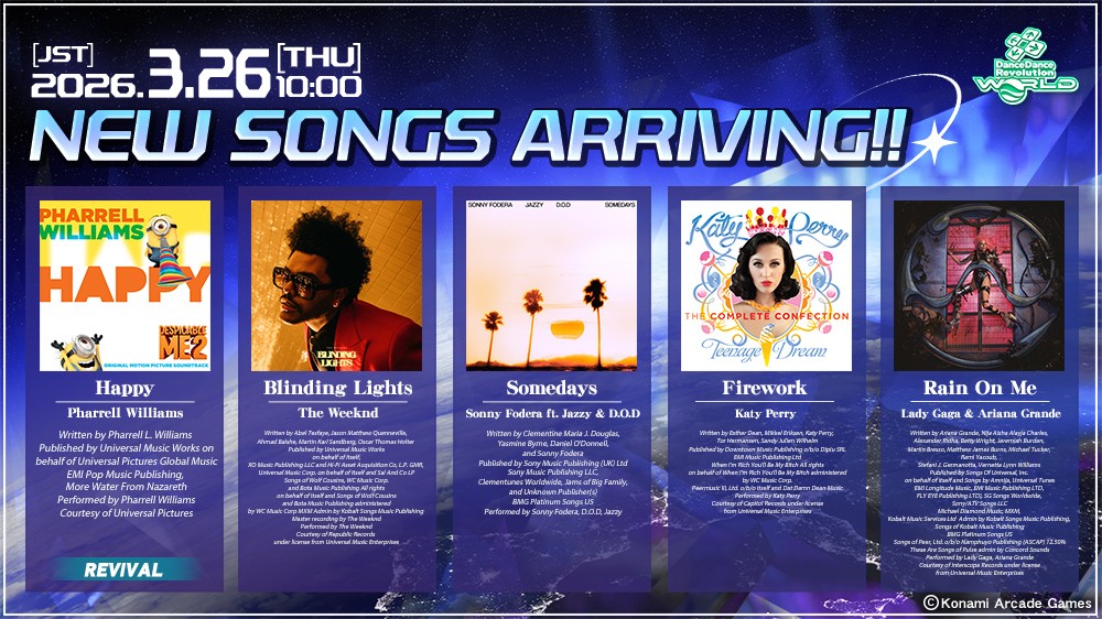 【新規楽曲追加!】 3月26日(木)10:00(JST)より、新規楽曲 「Blinding Lights」 「Firework」 「Happy」 「Rain On Me」 「Somedays」を追加! #DDR #DDR_WORLD #BEMANI https://p.eagate.573.jp/game/ddr/