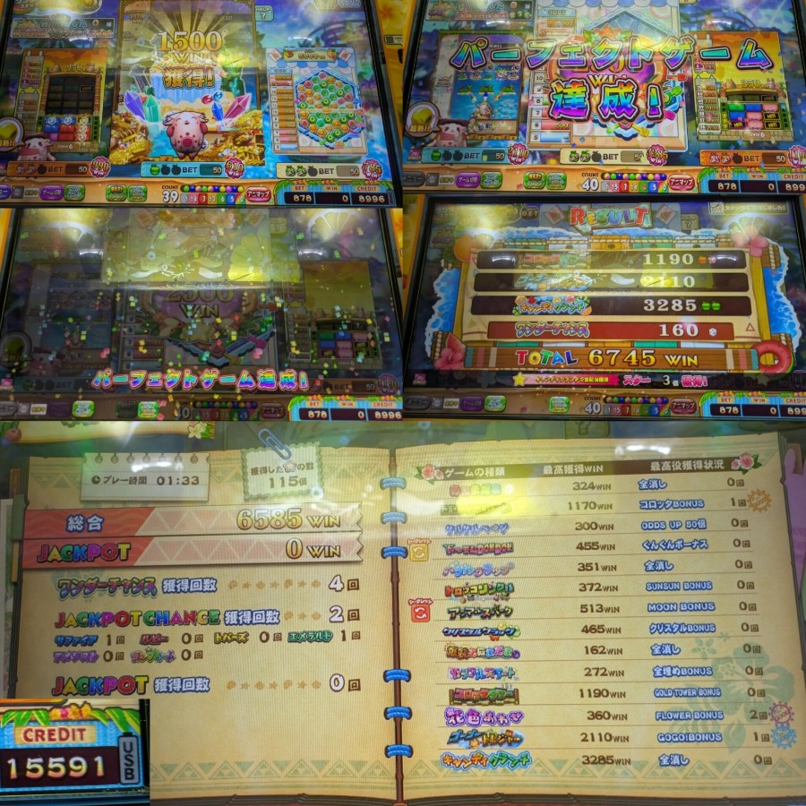 その後、早く帰らないといけない時間になったので爆発したら最強のゲーム3面にしつつワンダーを消化してたら... ゴーゴートレジャーで初めてのゴーゴーボーナス獲得!! そして...前のゲームで30球台のゲームが2〜3連続していた上でまさかのパーフェクトゲーム達成!! しかも...キャンディクランチの金配当50倍のおまけ付き! あまりにも超放出状態過ぎて初期クレ2000枚から15000枚までメダルが増えてしまいました!!!!