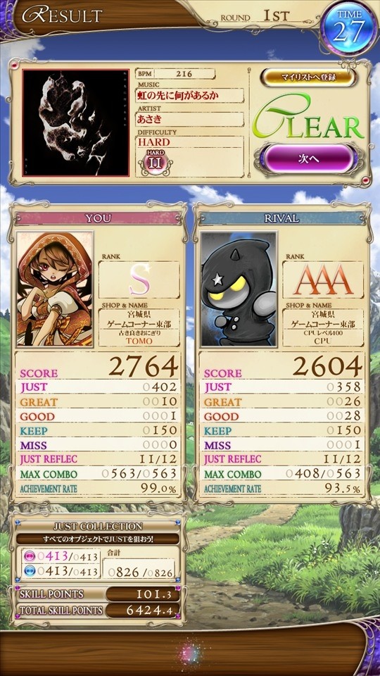 虹の先に何があるか jubeatでもプレイしていますが、 やっぱり初登場だったREFLECでやりたくなりますね* JRひとつ飛ばせなかったか〜 (´ε` )