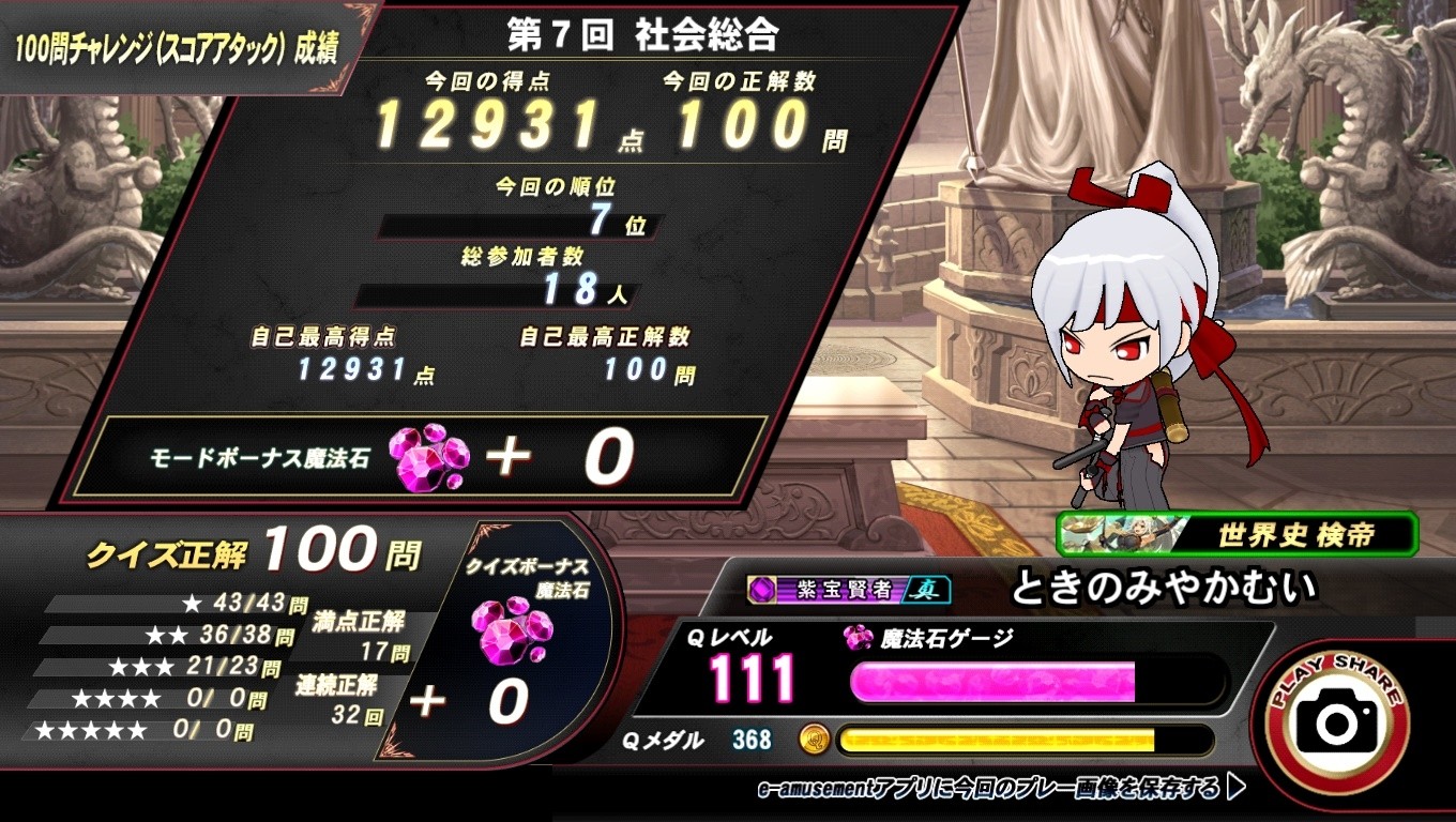 【久し振りの近況報告】 えー、皆さん2か月間に渡る「キャライベント2026・ポイント積み積みレース」お疲れ様でした!(`・ω・´)ゞ (走った方もそうでない方も) 私は今回は「世界史🌍️検定」壁紙→Gユリちゃん・前作で「リエル+G」が取れなかったリベンジ→グリエルさん・・・の2人でやってました。 結果はとんでもなく走ってる上位を追いかけてたら、2人共に銅メダル🥉(3位)。正直、3月に入って残業地獄+休出の連続でかなりしんどかったですが😫😵😇ほぼ毎日休まず少しずつコツコツと積み重ねてきました。 ※一時期はGユリちゃんで2位だった マラ様「さながら賽の河原🪨のように・・・」←マテ 「例えが悪いわ!(^_^;)」 歩みを止めず、頑張ってきてよかったです\(^o^)/ キレイにピタリなポイントには出来ませんでしたが・・・(^_^;) 友人「明らかにガチ勢🤔」 「10万いってる人もいるんだぞ?😎それに比べたら明らかにパンピ!」 友人「2人を足したら約16万だろが🤔ギ○ューと同じだな」←ん? 「足すなバ○😎戦闘力で例えんな」 グリエルさん「『世界史🌍️検定』が大きかったですね。お疲れ様でしたm(_ _)m」(紅茶☕️を淹れながら) ※ポイントは検定・ウォーズと、協力、少しトナメと100チャレで稼いだ Gユリちゃん「2か月もの間、ありがとうございました!数多くの方達とのお手合わせ、忘れません!」 マラ様「称号も取れたしね(Gユリちゃんはギリ10位)」 友人「!?まさか・・・け、ん、て、い・・・?」←ん? 「今度からお前のこと、『河馬🦛人間』って呼ぶわ😎」 ※検定自体は13位と15位。上位が分厚すぎてグリエルさんは11位(検王)で終了(←よってパンピ) グリエルさん「今回は壁紙にも出てましたし、譲っておきましょう」 Gユリちゃん「修羅殿、重ね重ね礼を言わせて下さい!」(感激🥲) マラ様「そういえば、最近の検定はグリム推しよね?」 グリエルさん「そうですね、マスターも出ていましたし。他の皆さんもそのうち登場するでしょうね(私は以前、出ましたので)」 ポイント重ねのプレッシャーからやっと解放されたので、今後は少しまったりとやっていきたいと思います😉(この2か月かなり💸したので😇) イベントの全スケジュールが終われば実装されてないグリム達はまたトーキョーに帰ってしまうので、走ってくれた2人は少しお休みしてキャラ変して残りの期間を過ごす予定です。 協力等でマッチしたら宜しくお願いします!(`・ω・´)ゞ [画像]昨日は寝る前に新たに始まった「社会100チャレ」を甘口はクリアしました(グリエルさんの方では固まって、ちょっと事故りましたが😇) もうポイントを気にする必要はないので、これからは回収も兼ねてやっていきます💪 友人「手抜きすんなや🤔」 「得意がないパンピだから甘口専門だぞ?😎」 友人「文系は激辛限定な🤔」 「お前が勝手に決めんな😎」 マラ様「アニゲーじゃ2人で2回失敗したけど(←パンピ)それ以外は一発でクリアしてるわね。基礎は出来てる感じかしら?」 「流石にクイズも20年やってりゃあねぇ(^_^;)」 グリエルさん「回収をなされるのなら、もっと鍛えないといけませんね。私にお任せ下さい」(大量のドリル作成中)←マテ