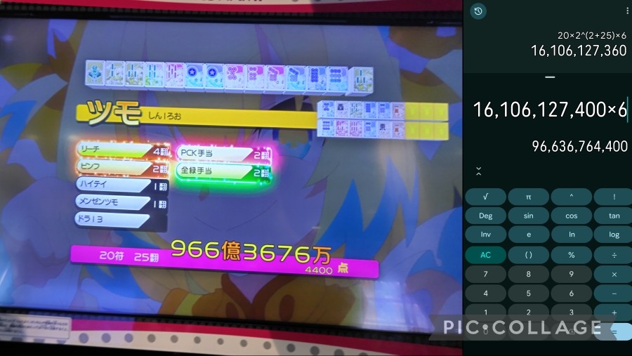 底なし沼卓でおでかけ対局をぶん回しての今回の最高得点。 結果は11戦して6-3-2(2③②1②111③11、○はトビ) 親のツモ和了り+他家の割れ目∴96,636,764,000点也 効率よく伸ばすなら索子のタテチンが狙い目でしょうか?