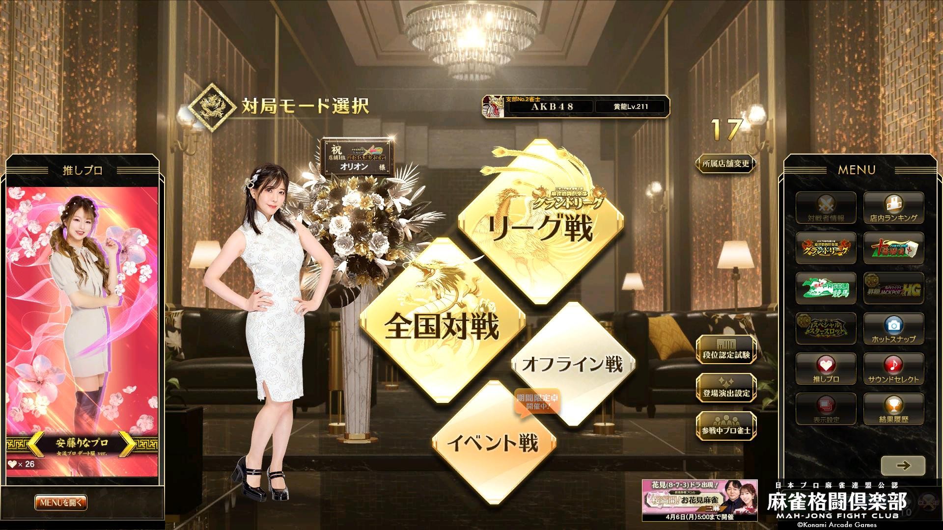 2026年4月2日分 対局モード選択画面に 高宮まりプロ (まり様&まりしゃん様) です🙇✨🀄