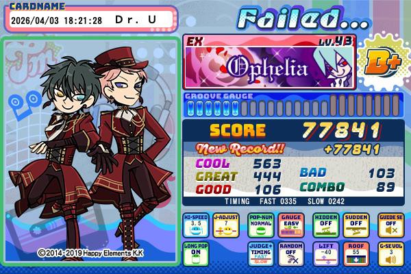 それでまあ序でなので今日は新規特攻枠もこの御方で。 (歌詞聞いた感じ)此処で言うオフィーリアって元ネタはハムレットよね。 まあ確かに「架空の人物」で間違ってはいないけど… …正直現状で触るには体力面含めてキツかったんですけど、それでも若干無理してでも触り続けた方が良い譜面かもってなったのが初見の感想。 と言うのも終始短い片手トリルたっぷりなんですよね。 コレが(譜面の覚え込みでも)冷静に認識出来てある程度押せるようになれれば他にも良い方に作用しそうな気がするんですよねえ…(こうしてまた性懲りも無く生まれる特攻の言い訳)