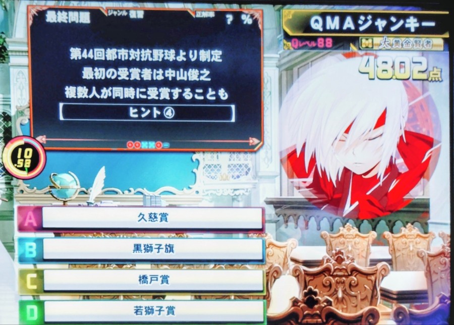 これは若獅子賞が正解 10秒だと、連想クイズでは4つ目のヒント出る前に答えなければならないのが厳しいです