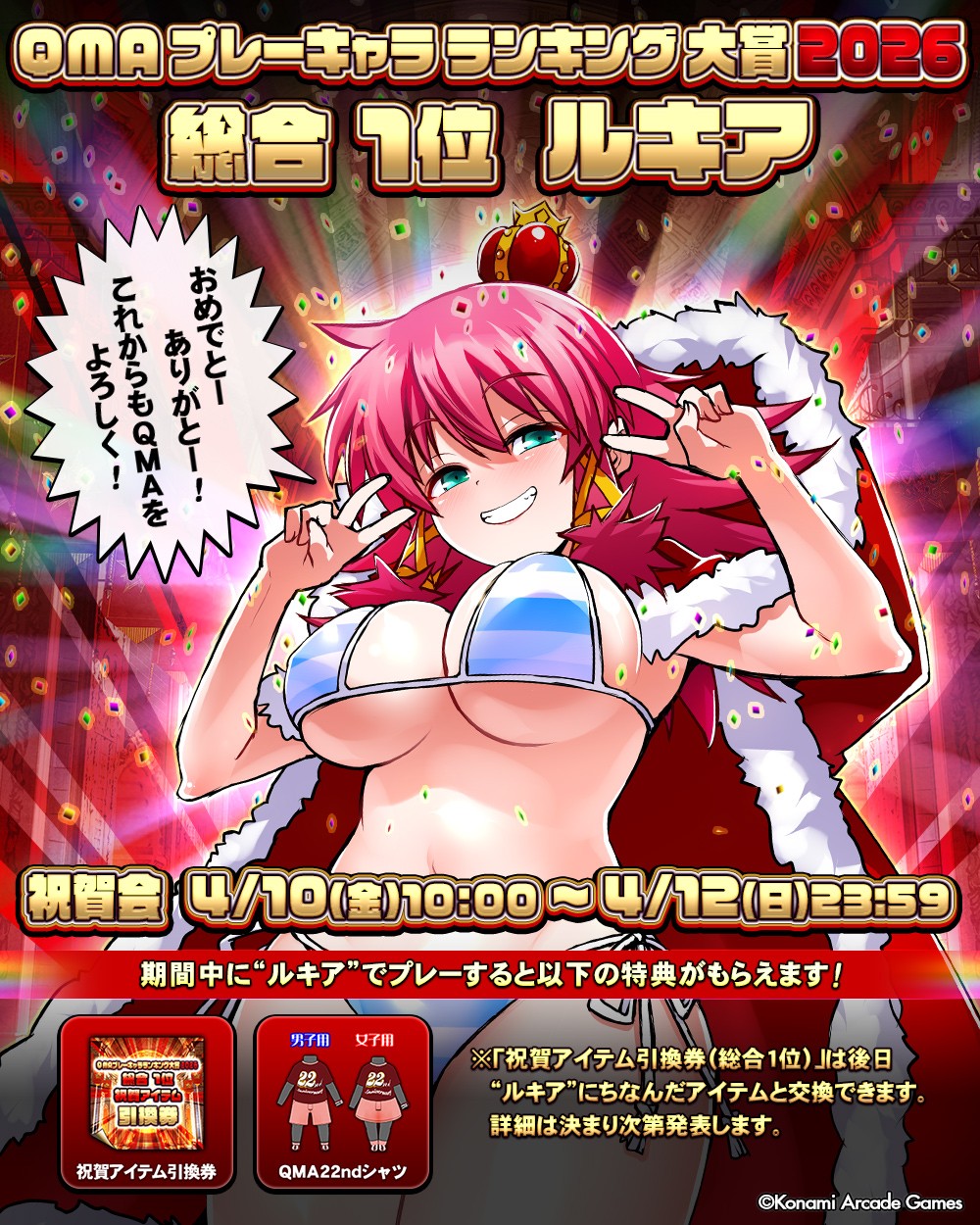 本日から「QMAプレーキャラランキング大賞2026」最後の3日間! 4/10(金)10:00~4/12(日)23:59で総合1位「ルキア」の祝賀会を開催! 総合と女子の部のプレー特典は異なるアイテムをご用意! #カードコネクト の二次元コードもどうぞ! https://p.eagate.573.jp/game/qma/19/info/event2.html #QMA #緋のアルカディア #ルキア #桑島法子