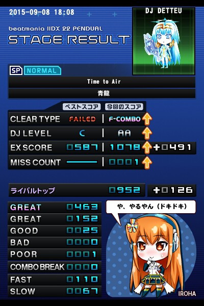 軸や折り返し階段(端は二回叩く)等、これも切りやすい譜面 でも切った原因は休憩中の余所見() だってあと二小節休憩長いと思ってたもん()