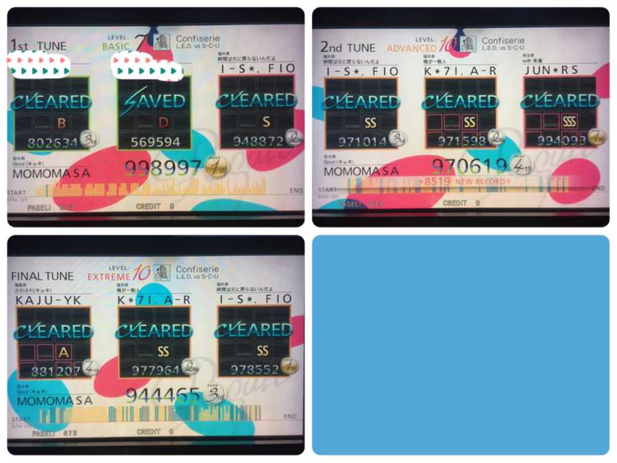 Confiserie ふぃおさん、えあさん、JUN*RSさん、ダイさん マッチングありがとうございました!(≧∇≦) 緑譜面序盤で凡ミスして再EXCならず(^^;; 黄色譜面はだいぶ伸びましたね\\\\٩( 'ω' )و //// 赤譜面はSS乗らなくなりました\(^o^)/ T-GAWAさんみたいに研究しなきゃダメかも(´×ω×`)