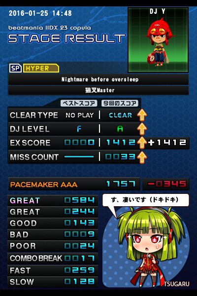 新規☆10ノマゲ!!\\\\ ٩( 'ω' )و //// シーズンライン(エキストラ隠し)楽曲、ナイトメアビフォーオーバーシープのハイパー!! このミスカウントならハードも狙えた…!! くっそう!!!ヾ(:3ノシヾ)ノシ 現在シーズンライン楽曲は2曲あるんだけど、どちらもホントにカッコいい。 条件を満たさなければ出現しないなんて、勿体無いよなあ…w