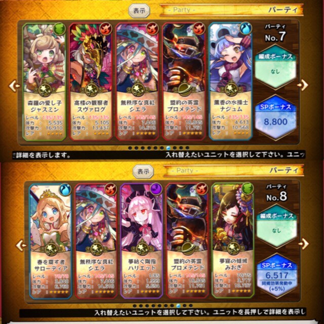 上:多段や複数凸を考えたパーティ 下:DPSが高い奴集めた 覚醒はフル凸と考えて、どっちの方がギルバトに向いていますか?アドバイスしてほしい #メルスト