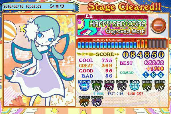 新規46、ハッピーサッドコア 三度目の正直でクリア出来た!嬉しい! ハイスピガン上げで見えたやつを叩いてみる感じで。後半何叩いてるかわからなかったけど楽しかったw