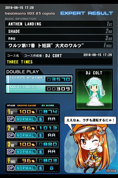 同じく自分のオリコDPN。 組んだ本人が普通に曲忘れててギクシャクするとかいうね(( なんとなく大犬は遠慮して押しやすくしてあるな…とか思ったらラストちょっと難易度上げてある感じでしたね~