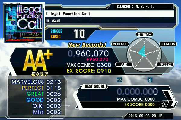 Illegal Function Call (BSC) 一発アンロック完了。 最初の低速で凡ミス2発やらかしたので厳しい戦いになりました。 本家IIDX版はFHSなので影響は少ないですがDDR版はBPM速い曲なのでハイスピも悩む曲。